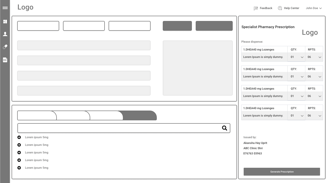 I started with meetings with the client and team. We all together got a demo of the old tool. I got temporary access to this tool to do my R & D. After understanding it, I started with the style guide and then quick UX ideas, sketches. I attended lots of meetings with clients, the team, and the pharmacy’s actual users, we had some live demos of the wireframe ideas, I shared screen and made updates live as per the end-users sitting in front of me live :). This was really a great experience for me. The managers and team of the Specialist pharmacy were very friendly and polite during the meetings, they really cooperated with me. What a team, hats off.   After few iterations, the team has decided on the below basic layout. All the screens were based on this layout.